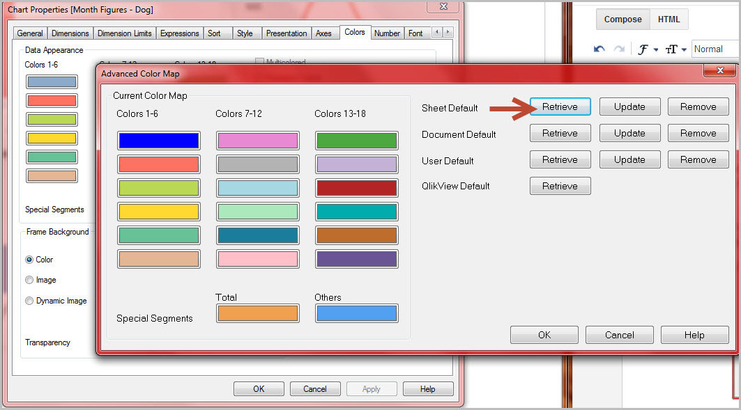 - Right Click the chart "Month Figures - Dog", select "Properties", "Colors" and click on the "Advanced" button (as in Step 2)